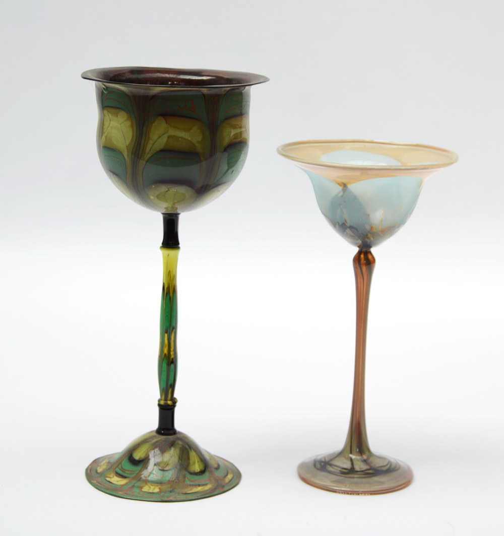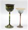 Lotto di due coppette a stelo lungo in vetro a decori policromi di manifatture e misure diverse