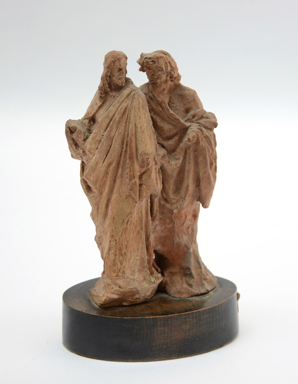 Benin "Scena Sacra" bozzetto in terracotta firmato sul fianco (h cm 17) poggiante su base ovale in legno (difetti)