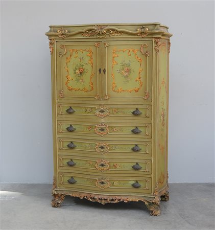 Mobile in stile veneziano in legno laccato, decorato in policromia e oro a fiori, foglie e volute. A due ante e cinque cassetti sul fronte, fascia e piedi sagomati e intagliati (cm 120x170x55) (difetti)