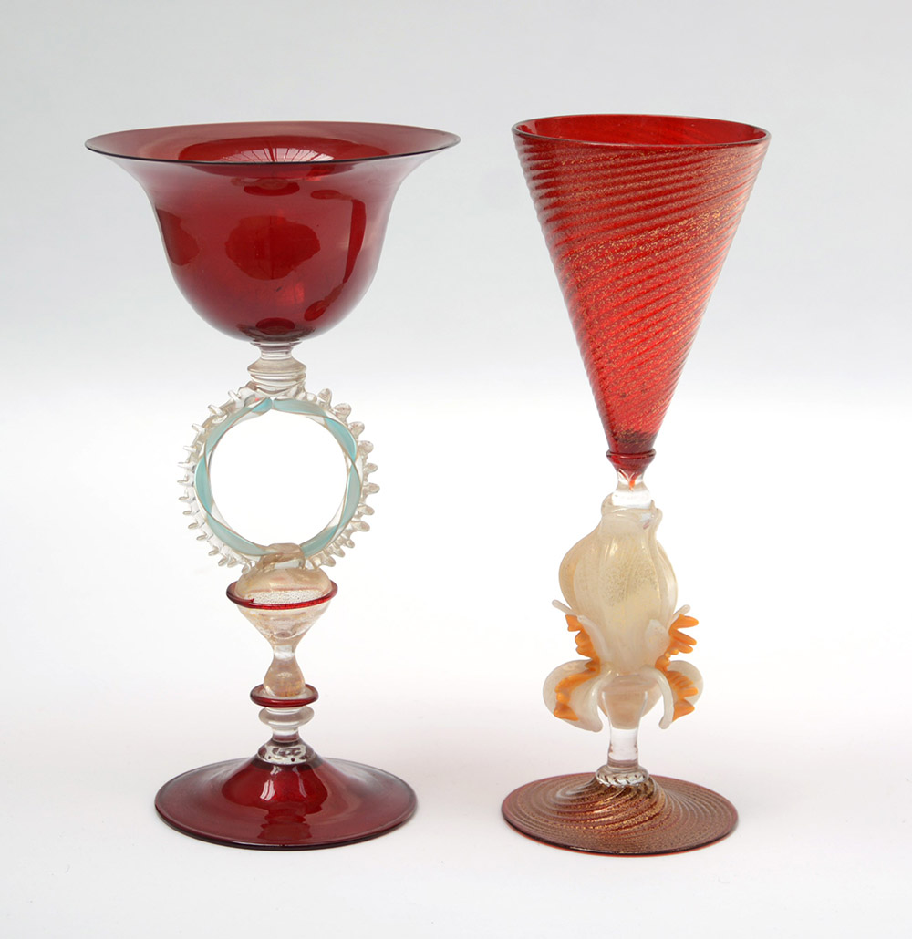 Manifattura di Murano Sec. XX, lotto di due bicchieri in vetro soffiato rosso e trasparente con inclusioni di foglia d'oro e applicazioni di pasta vitrea (h cm 25)