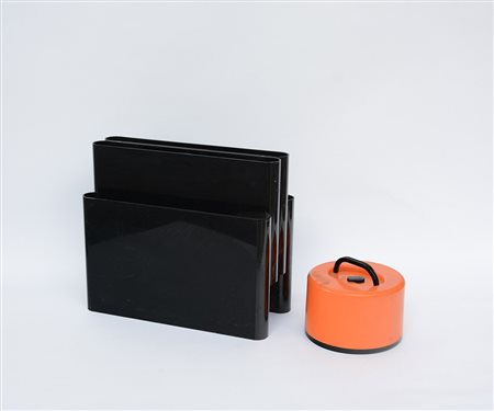 Lotto composto da un portariviste modello "4676" in plastica nera di Giotto Stoppino unito a un portadischi in plastica arancione e nera di Olaf Von Bohr. Produzione Kartell, Italia (misure diverse) (difetti)