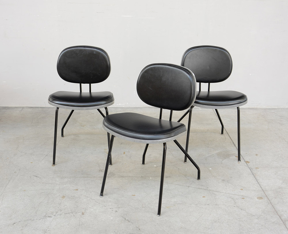 MIM Roma, lotto composto da tre sedie in tubolare metallico verniciato nero e similpelle nera. Italia, anni 70 (difetti)