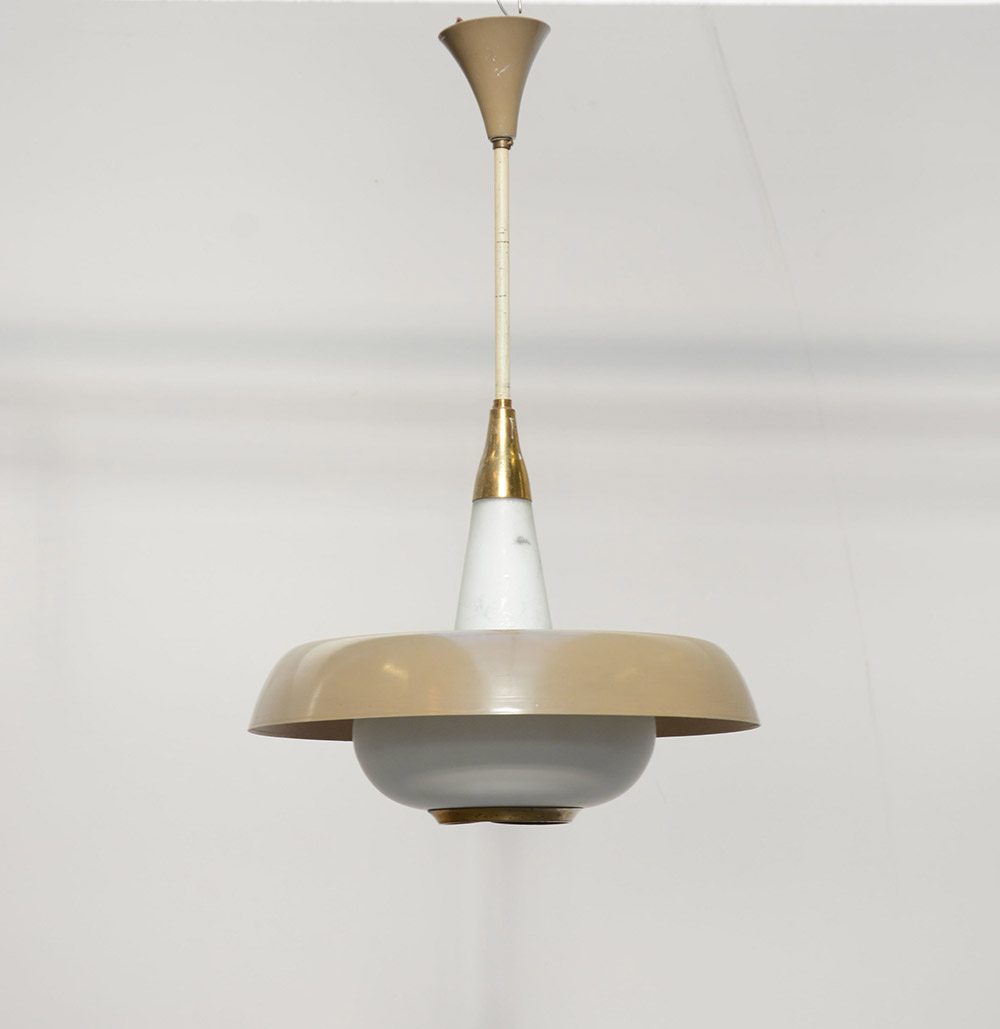 Lampadario con paralume in metallo laccato color tortora. Italia, sec XX (h cm 60) (difetti)