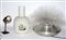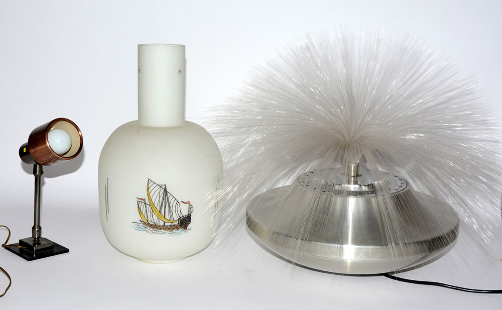 Lotto composto da due lampade da tavolo anni 70 in materiali diversi e da un paralume in vetro dipinto (difetti)