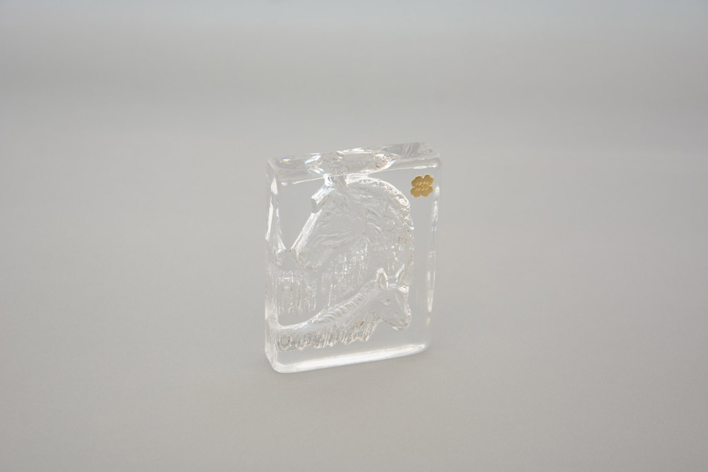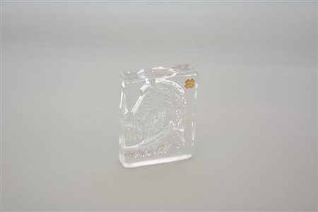 Daum Francia Presse papier in vetro decorato a testa di cavallo.Targhetta commemorativa recante date 1948-1998 in alto a destra (cm 12,5x9,5)