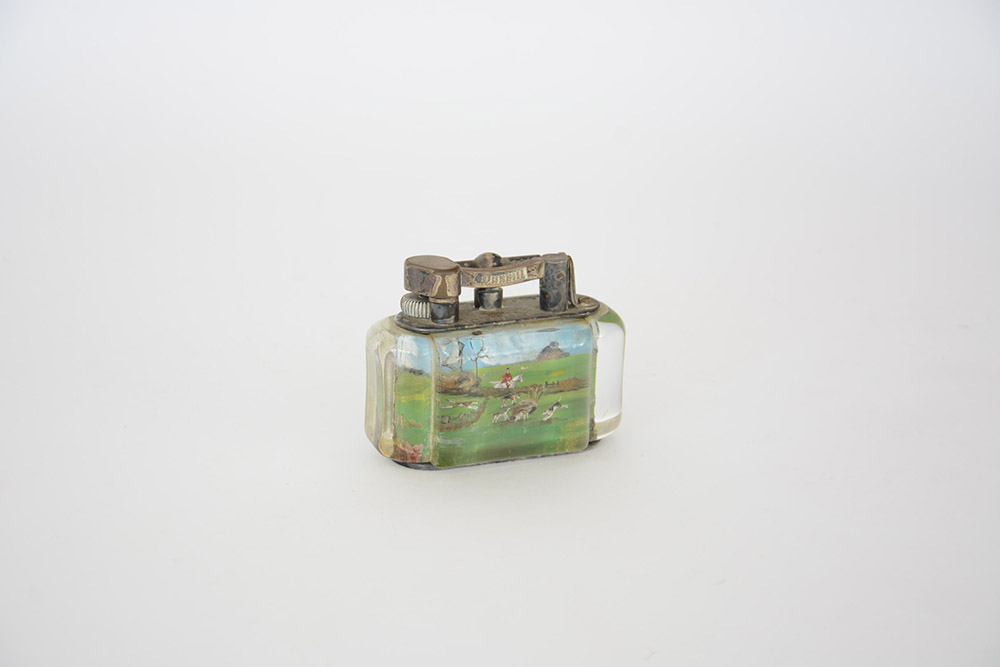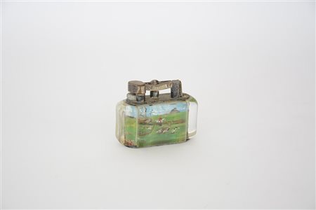 Accendino marca Dunhill con corpo in vetro decorato a scene di caccia alla volpe (h cm 8) (difetti)