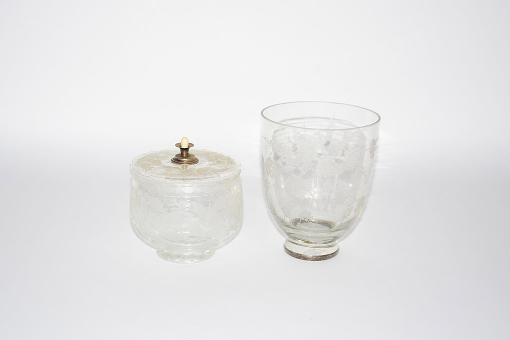 Lotto composto da una compostiera e da un vaso in vetro incolore inciso alla mola. Italia, anni 20 (h cm 15 e h cm 18) (difetti)