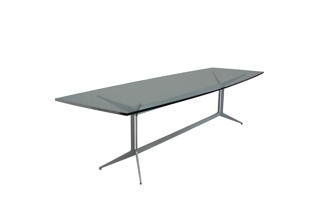Grande tavolo da riunione con struttura in metallo verniciato grigio e piano in cristallo molato. Italia, anni 70 (cm 294x72x94) (lievi difetti)