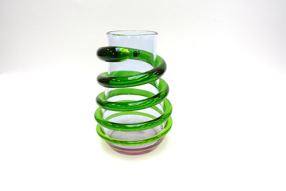 Carlo Moretti Vaso in vetro sommerso incolore e ciclamino con applicazione a spirale in rilievo. Murano, 1984 (h cm 26)