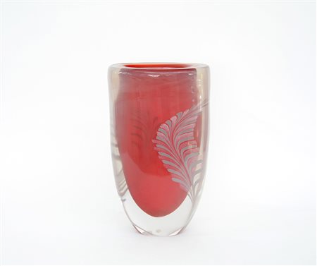 Manifattura Toso, Murano, vaso in vetro sommerso di forte spessore incolore e rosso con inclusione di fasce rosa. Firmato "Toso Murano" h cm 36)