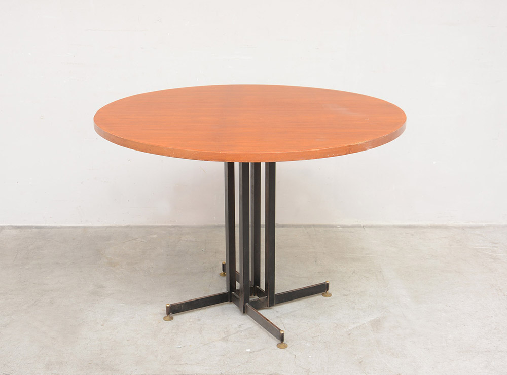 Tavolo con piano tondo in legno impiallacciato e sostegno in metallo verniciato nero e ottone. Italia, fine anni 60 (d cm 112x h cm 78)(difetti)