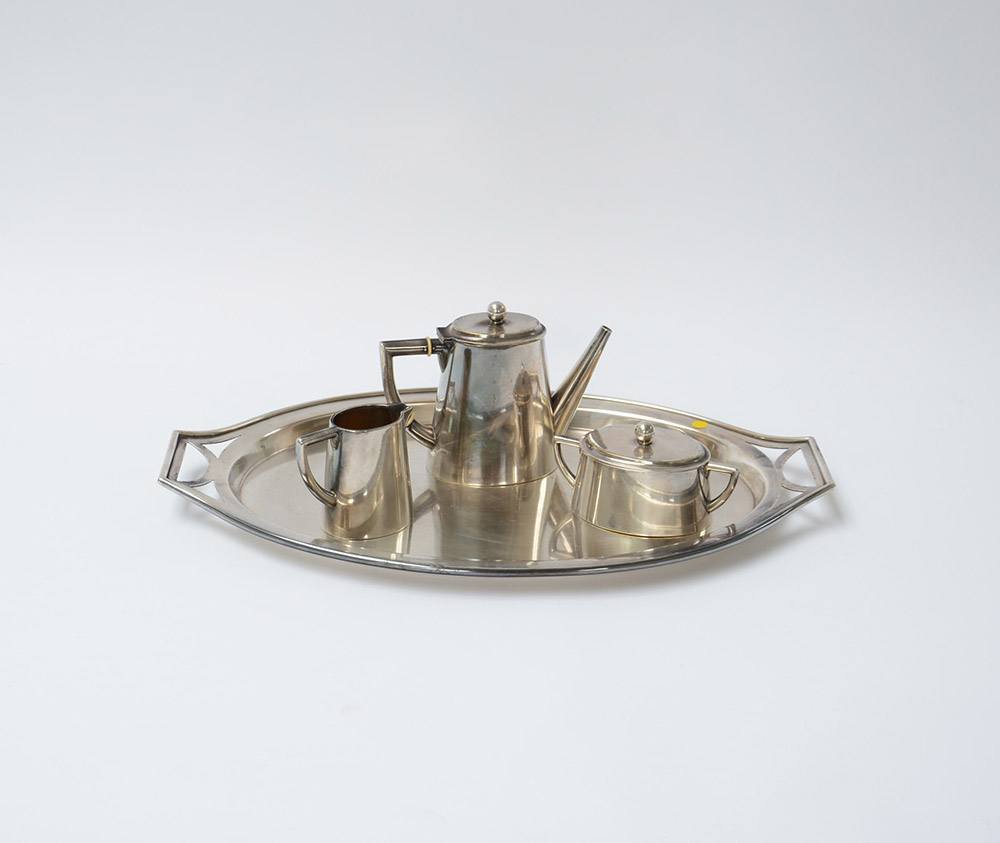Servizio da caffe in metallo argentato composto da vassoio biansato, caffettiera, lattiera e zuccheriera, punzoni Giacchè Milano. Anni 30 (lievi difetti)