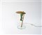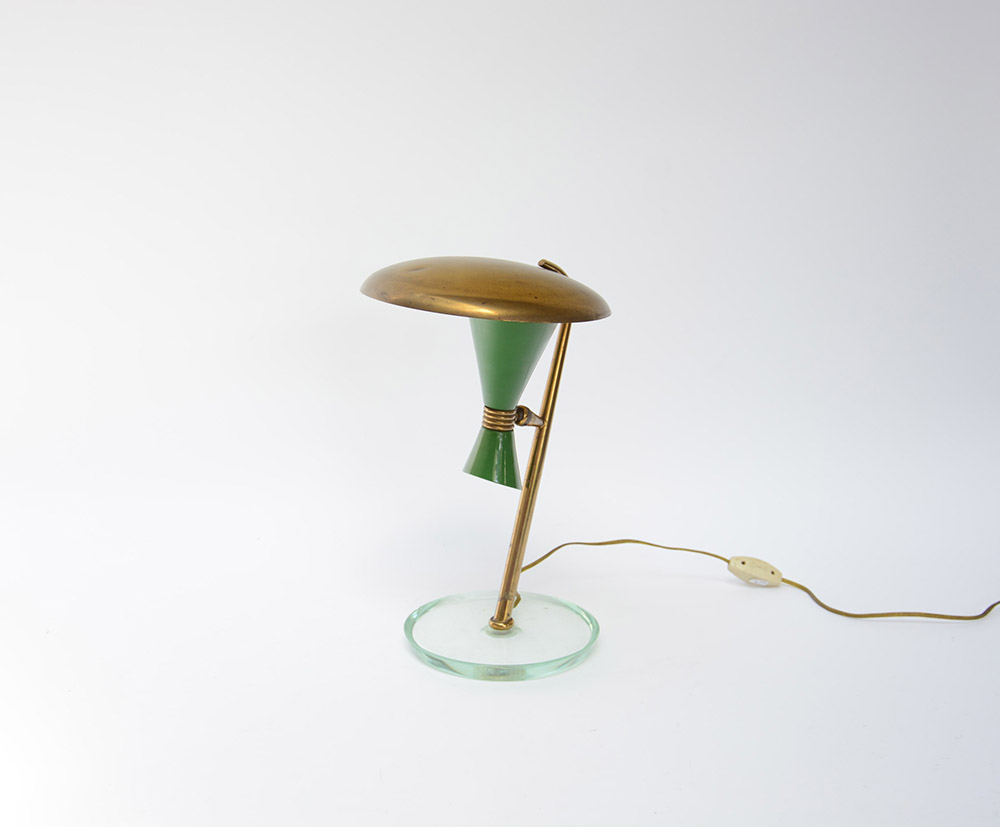 Lampada da tavolo con base in cristallo molato, struttura in ottone e alluminio verniciato verde. Italia, anni 50 (h cm 33) (difetti)
