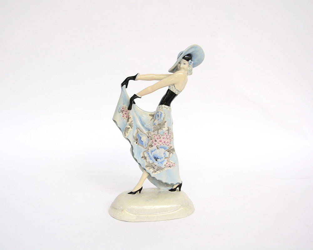 Manifattura Goldscheider, Vienna, statuetta in ceramica policroma raffigurante una figura femminile, marcata sotto la base (h cm 40) (lievi difetti)