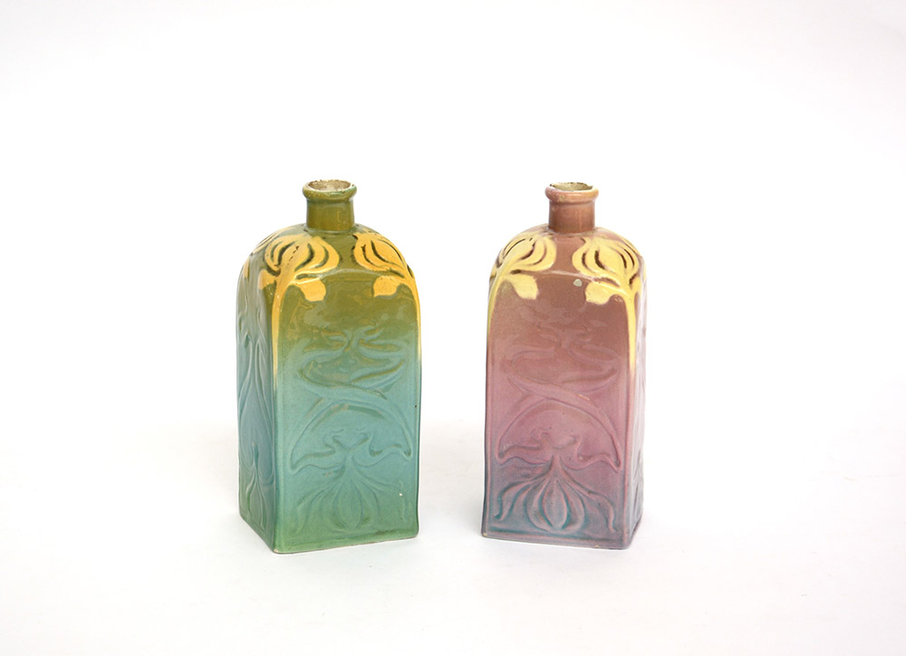 Mario Salvini Lotto di due vasi in ceramica su base rettangolare con decori floreali a rilievo nei toni del verde e del lilla, firmati sotto la base. Italia, 1905 circa (h cm 20) (lievi difetti)