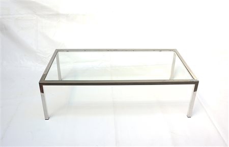 Tavolo basso in metallo cromato con piano in vetro. Italia, anni 70 (cm...