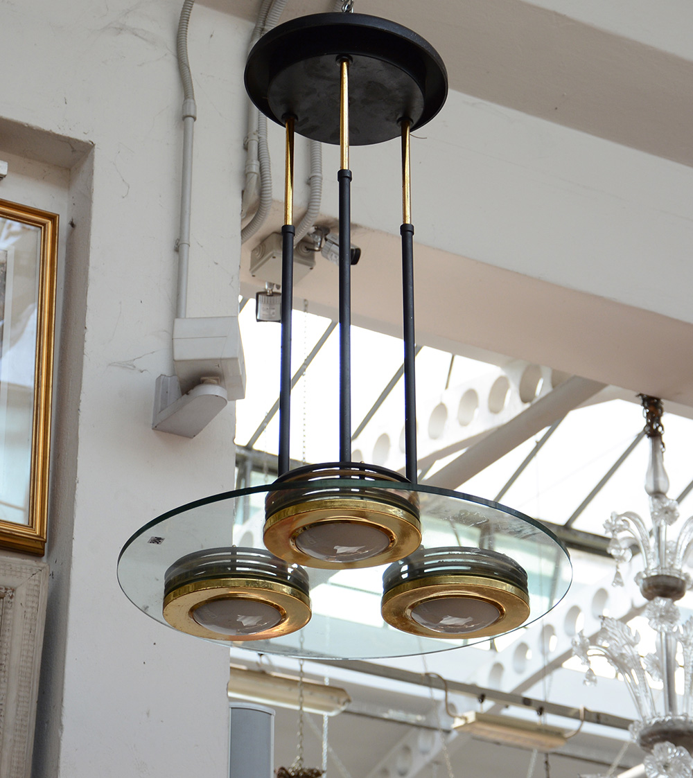 Lampadario a tre luci in metallo e ottone con disco in vetro. Italia, anni 70...