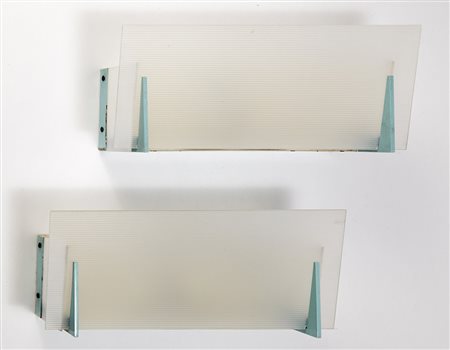 Pierre Paulin & Disderot (attribuito) Coppia di appliques in metallo perforato laccato bianco e vetro opalino. Possibile produzione Pierre Disderot, Francia, anni 60 (cm 38x17,5x12,5) (difetti)