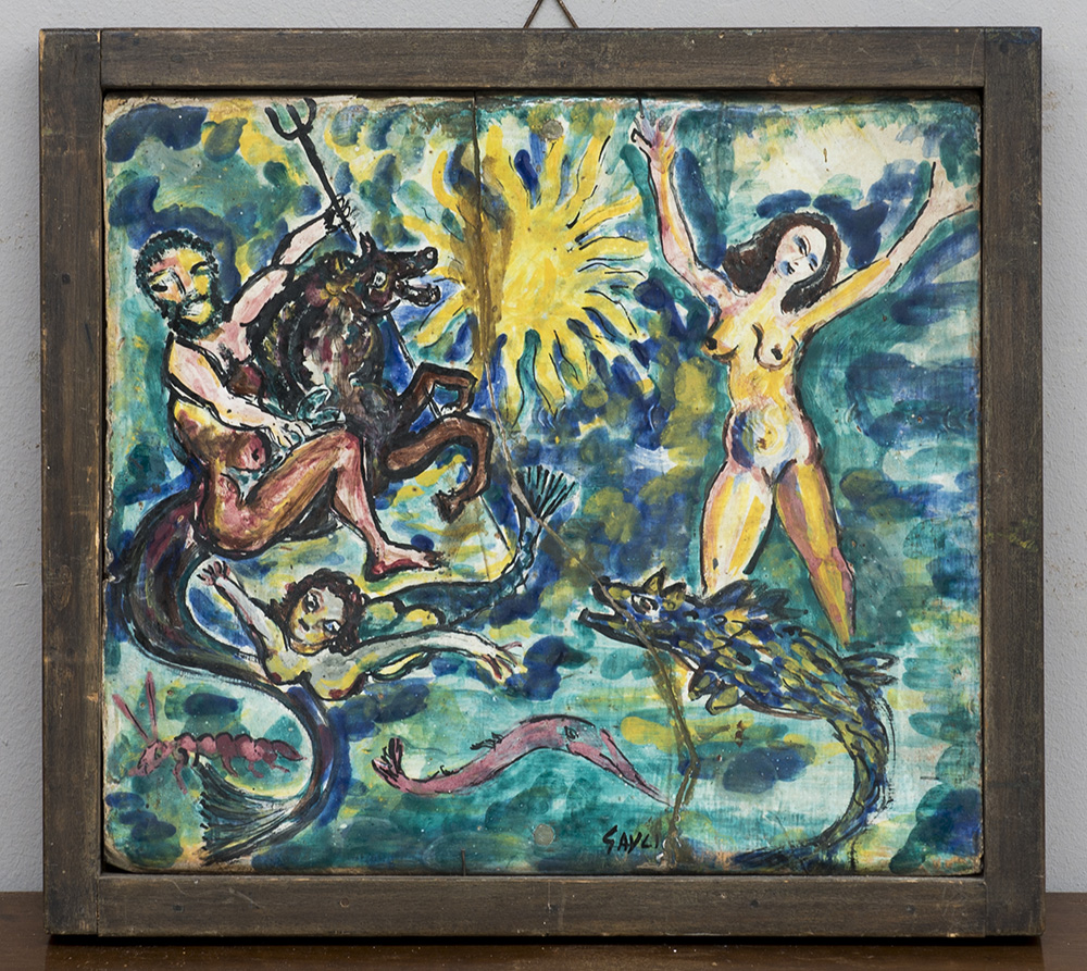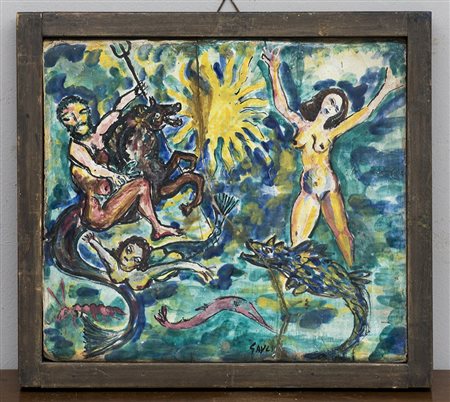 Piero Gauli Milano 1916 2012 "Il trionfo di Tritone", placca in ceramica dipinta. Firmata in basso al centro, in cornice (cm 29x32,5) (gravi difetti e restauri)
