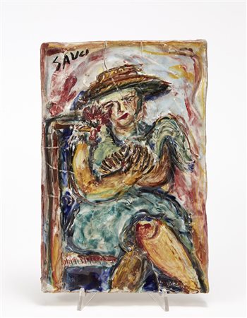 Piero Gauli Milano 1916 2012 "Donna con gallo", Roma 1957. Formella in ceramica a rilievo smaltata in policromia sotto vetrina. Firmata e datata al recto e al verso (cm 20x30) (difetti)