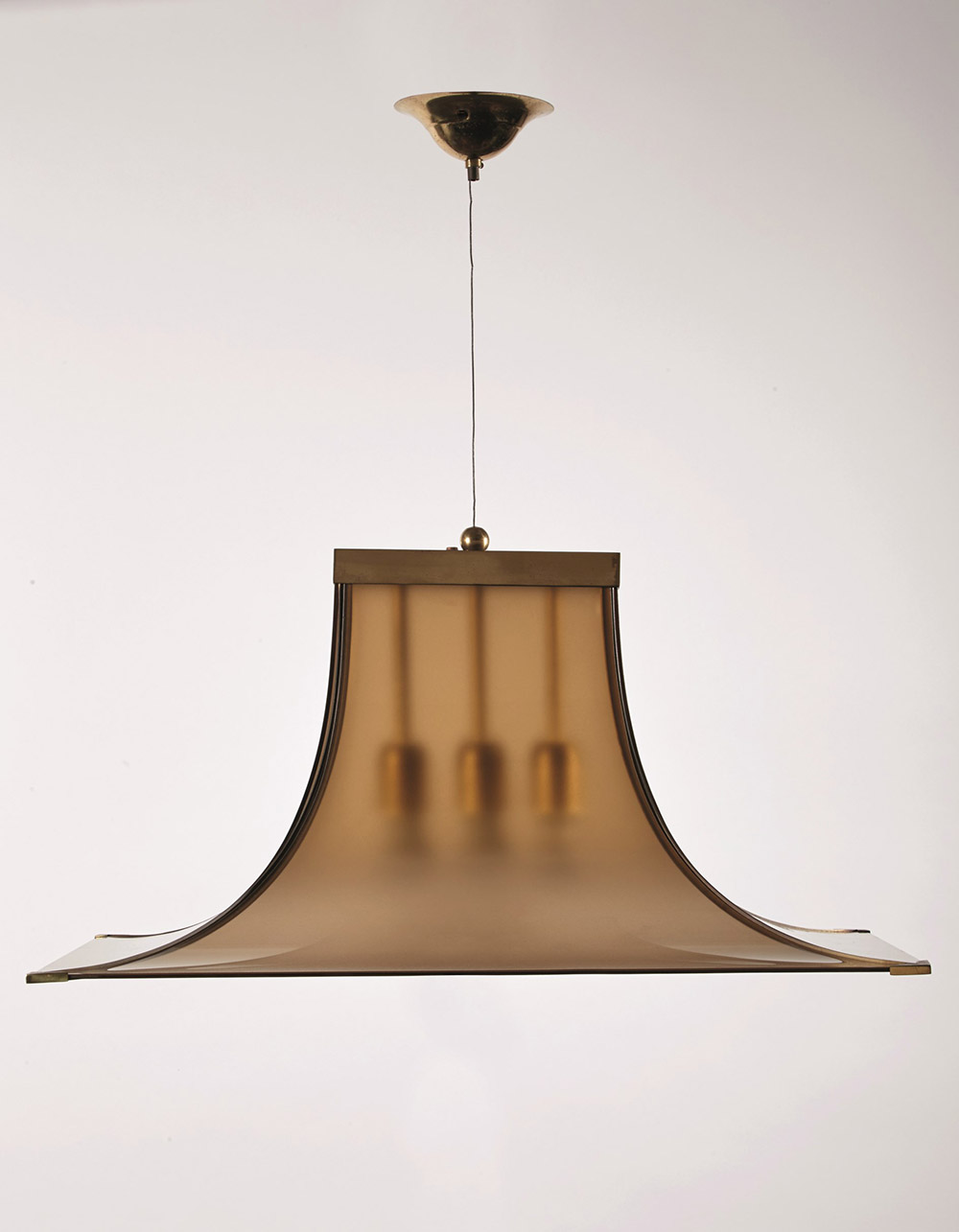 Lampadario a sospensione in ottone e cristallo ambrato curvato e molato. Produzione italiana, fine anni 60 (cm 69x75x51) (lievi difetti)