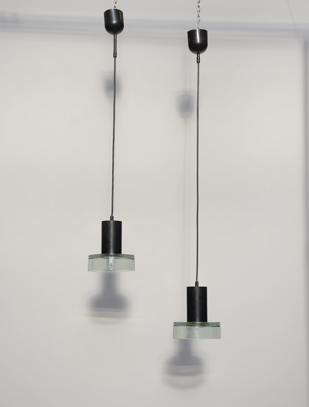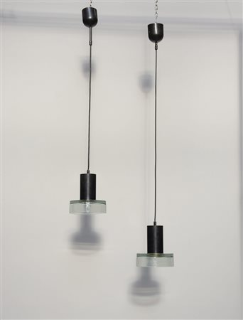 Flavio Poli 1900 1984 Coppia di lampade da soffitto con struttura in metallo verniciato nero e diffusore in vetro spesso verdino. Produzione Seguso, anni 70 (h cm 90, d cm 16) (lievi difetti)