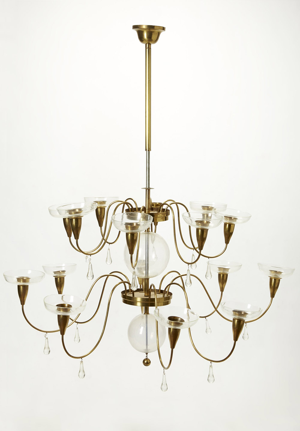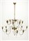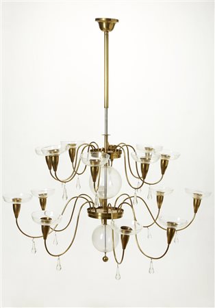 Strada (attribuito) Lampadario a sedici fiamme in ottone con braccia mosse, decorato da sfere, pendagli e piattini in vetro. Milano anni 40 (h cm 130, d cm 120) (lievi difetti e mancanze)