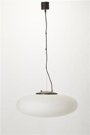 Stilnovo (attribuito) Lampada a sospensione con diffusore ellissoidale in vetro lattimo incamiciato e satinato sulla superficie esterna. Milano, anni 50 (d cm 51 h cm 33)