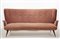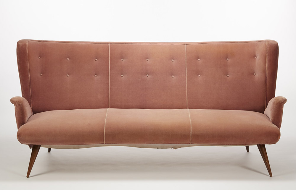 Divano imbottito a tre posti con struttura in legno, rivestimento in velluto rosa antico e gambe troncoconiche in mogano. Esecuzione Domus Nostra, Bologna, 1955 ca. (cm 210x 93x80) (lievi difetti) Provenienza: collezione privata, Bologna Accompagnato dal bozzetto originale del progetto di arredo