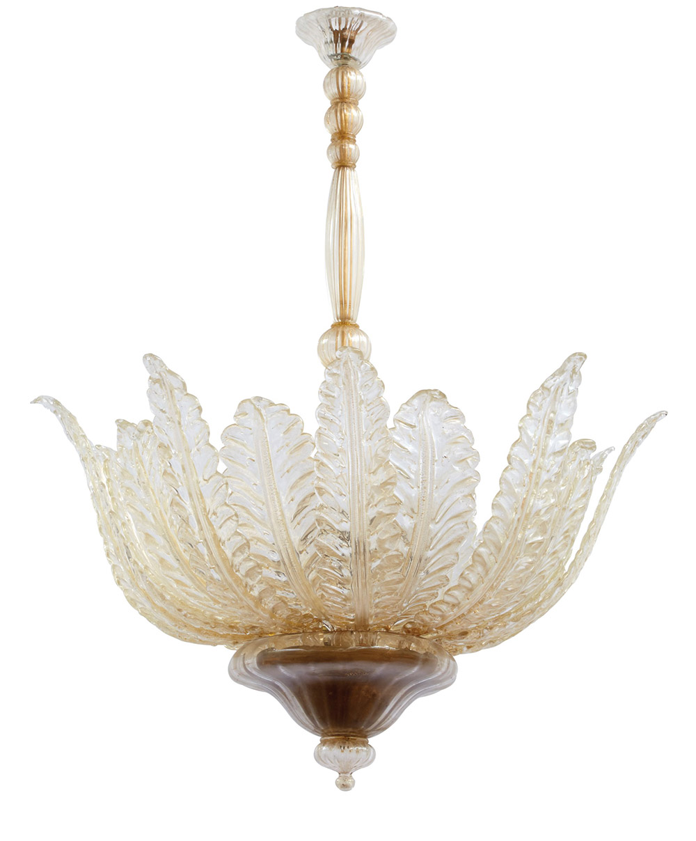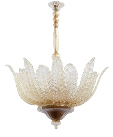 Venini, Murano (attribuito) Grande lampadario a venti foglie in vetro incolore con inclusione di foglia d'oro. Murano, anni 50 (h cm 120) (lievi difetti)