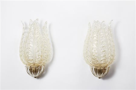 Venini, Murano (attribuito) Coppia di appliques a cinque foglie in vetro incolore con inclusione di foglia d'oro. Anni 50 (h cm 52 ca) (lievi difetti)