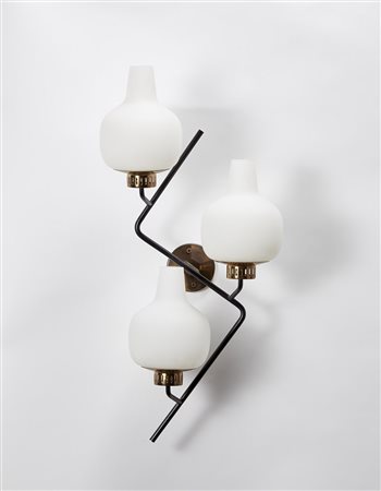 Stilnovo Applique a tre fiamme in metallo laccato nero, ottone e vetro lattimo incamiciato e acidato sulla superficie esterna. Milano anni 50 (h cm 56)