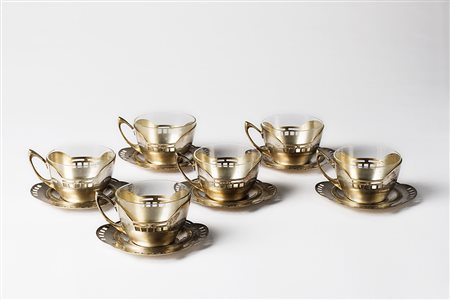 Hans Ofner (attribuito) 1880 1939 Lotto composto da sei tazze in vetro e metallo argentato con piattini. Produzione Argentor, Vienna, inizi del sec XX (lievi difetti)