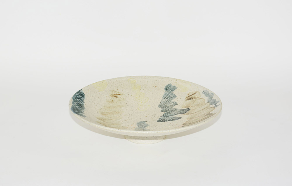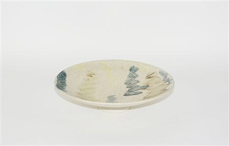 Guido De Zan Milano 1947 Piatto in ceramica decorato in policromia con soggetto astratto. Milano, anni 80 (d cm 26)
