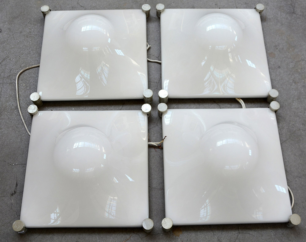 Elio Martinelli Lucca 1921 2004 Lotto di nove plafoniere modello "Bolla" in metallo verniciato bianco, alluminio tornito e metacrilato opalino. Produzione Martinelli Luce, anni 70 (cm 37x37x15) (lievi difetti)