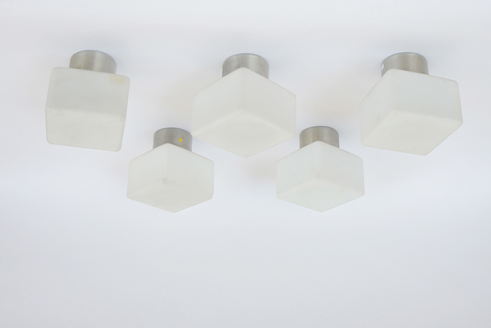 Elio Martinelli Lucca 1921 2004 Lotto di nove lampade da parete con struttura in alluminio e paralume quadrato in vetro incamiciato lattimo acidato sulla superficie esterna. Produzione Martinelli Luce, anni 70 (cm 15x15x16) (lievi difetti)