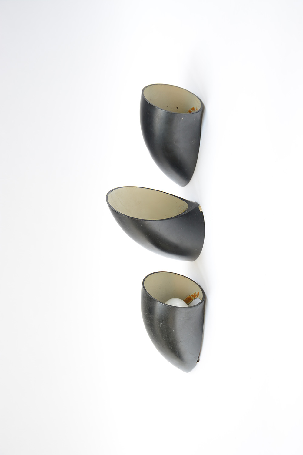 Lotto di tre lampade da parete in metallo verniciato nero. Produzione Martinelli Luce, anni 70 (difetti e mancanze)