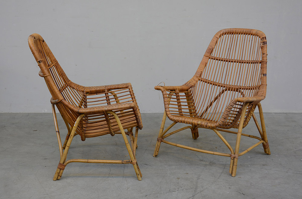 George Coslin Coppia di poltrone in malacca e canna d'India. Esecuzione Gervasoni, Italia 1956 ca (cm 75x94x70) (difetti) Bibliografia: G. Gramigna, Repertorio 1950-1980, Mondadori, Milano, 1985, p. 97