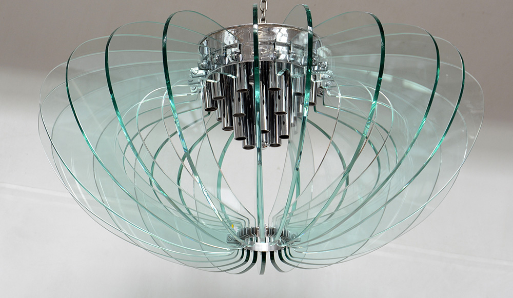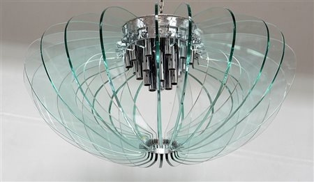 Lampada a sospensione con struttura in metallo cromato e venti flange in cristallo molato verdino di forte spessore. Esecuzione italiana, anni 70 (d cm 102, h cm 50) (lievi difetti)