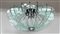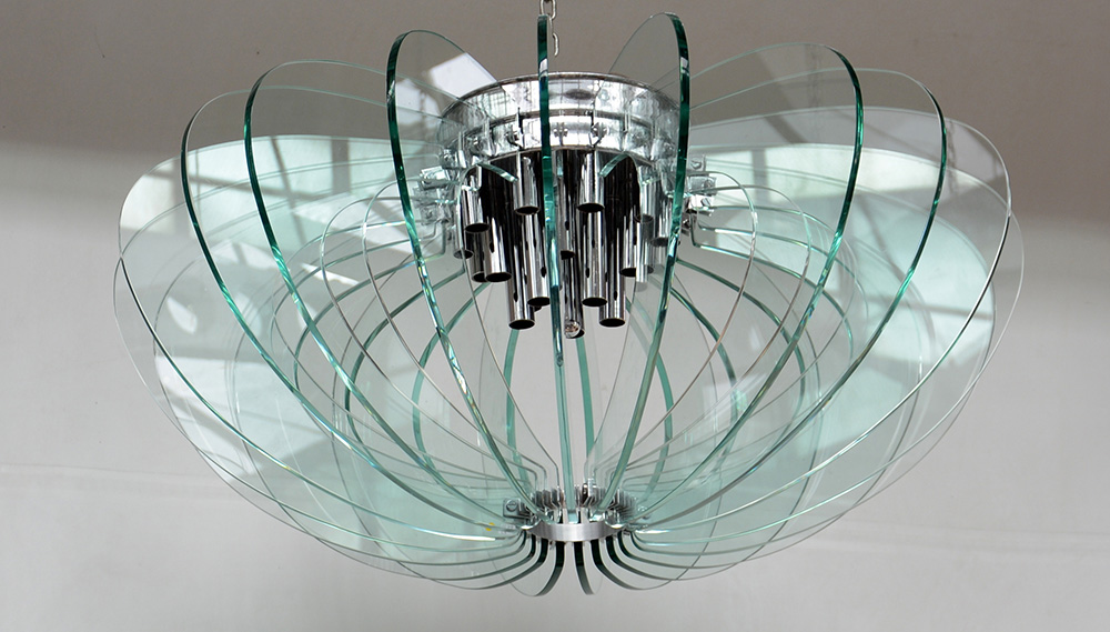 Lampada a sospensione con struttura in metallo cromato e venti flange in cristallo molato verdino di forte spessore. Esecuzione italiana, anni 70 (d cm 102, h cm 50) (lievi difetti)