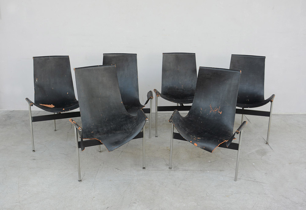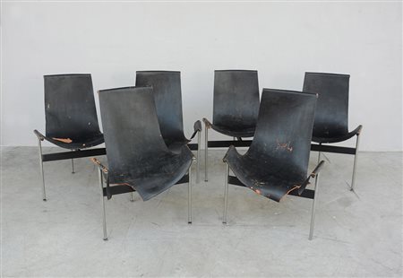 Ross Littell, Douglas Kelley, William Katavolos Lotto composto da sei sedie modello "T Chairs". Laverner International USA, disegno del 1952, prodotte da ICF De Padova dal 1964. Esemplari della fine degli anni 60. Acciaio satinato e verniciato nero, cuoio nero (cm 59x81x55) (gravi difetti) Bibliografia: "Domus", n. 290, gennaio 1954, p. 55; D. Gnocchi, E. De Padova. Intuizioni, passioni, incontri, Motta Editore, Milano 2006, p. 98