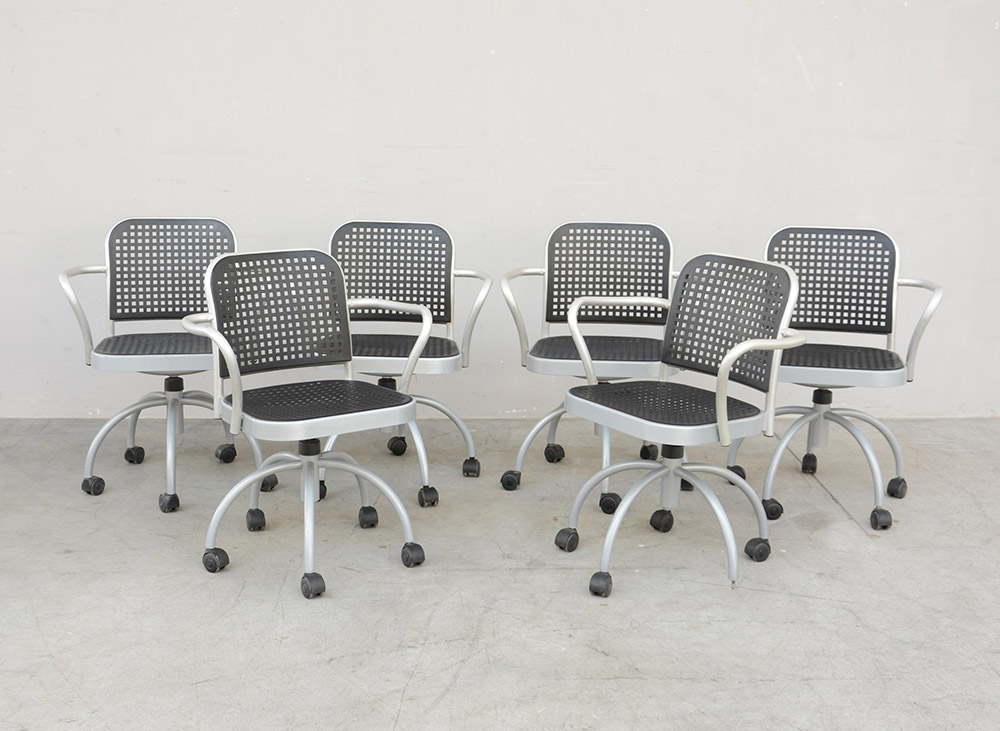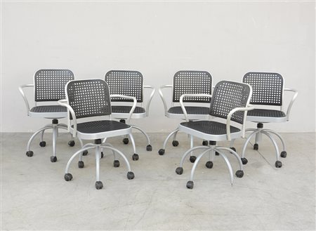 Vico Magistretti Milano 1920 Milano 2006 Lotto composto da sei poltroncine girevoli modello "Silver". Produzione De Padova, Italia, anni 70. Alluminio, metallo verniciato grigio e plastica nera (cm 64x80x42) (lievi difetti)