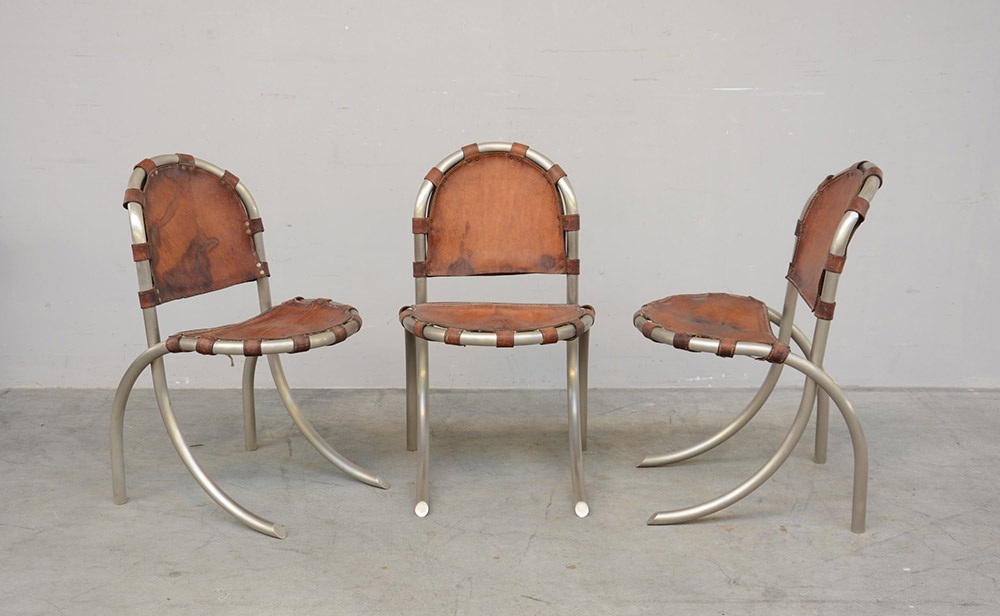 Alberto Bazzani Tre sedie in metallo nichelato con seduta e schienale in cuoio. Italia 1969 (cm 42x80x46) (difetti)