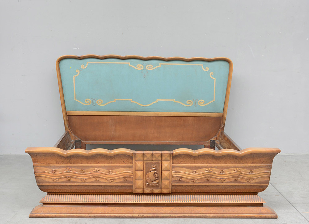Letto matrimoniale impiallacciato, lastronato e intagliato in radica e legno chiaro con motivi di gusto Déco. Esecuzione Alecta, Lissone, anni 30 (difetti)