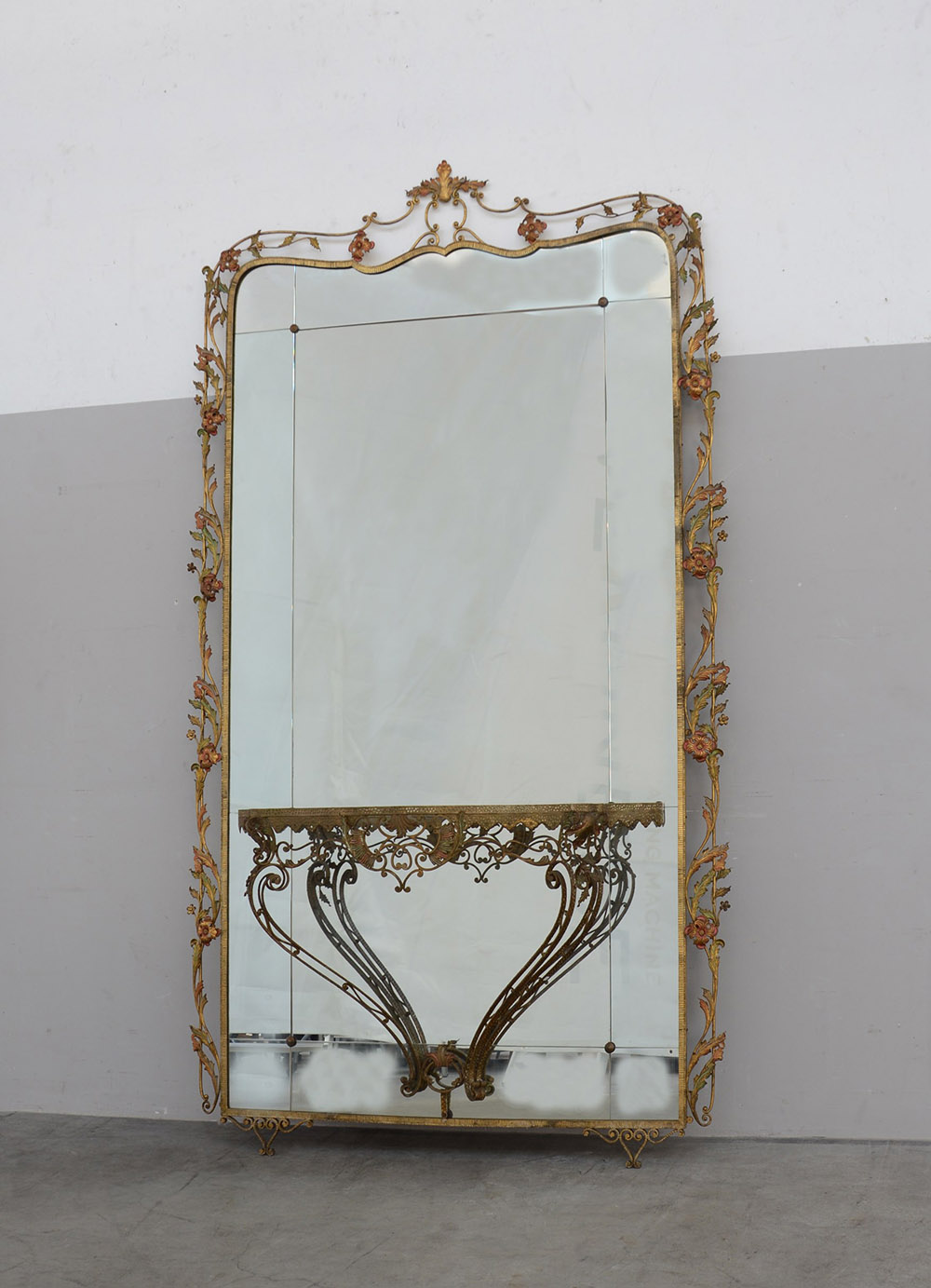 Colli, Torino (attribuito) Grande specchiera consolle con struttura in metallo dorato e decorato con foglie e fiori (cm 260x153) (difetti)