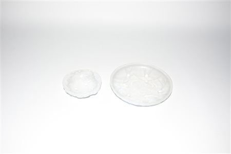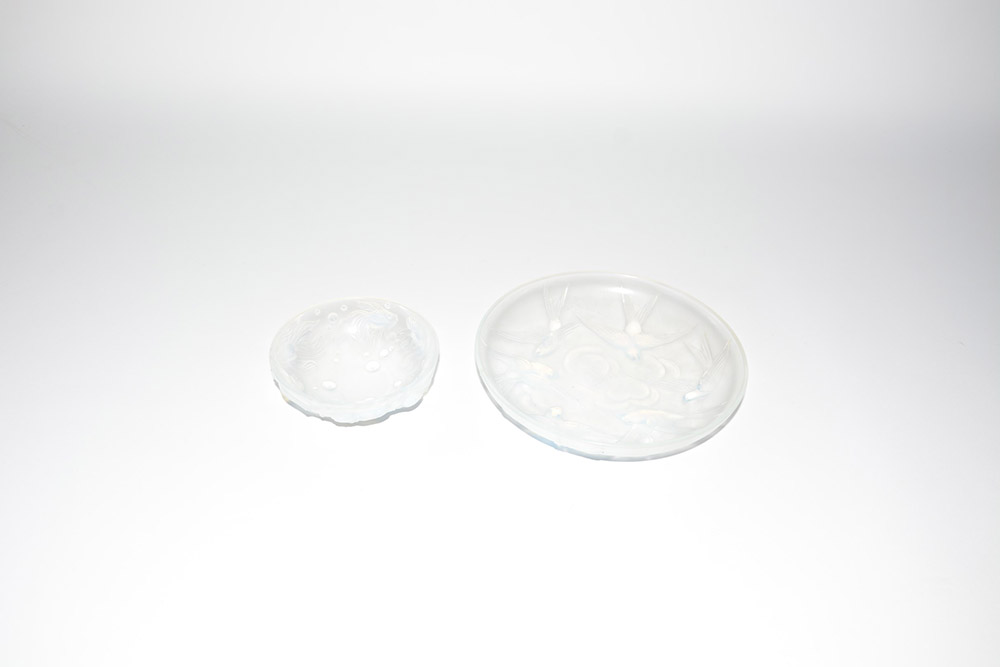 Sabino, Francia Lotto composto da un posacenere decorato a pesci e uno a rondini in vetro incolore e opalescente soffiato in stampo. Anni 20 (lievi difetti)