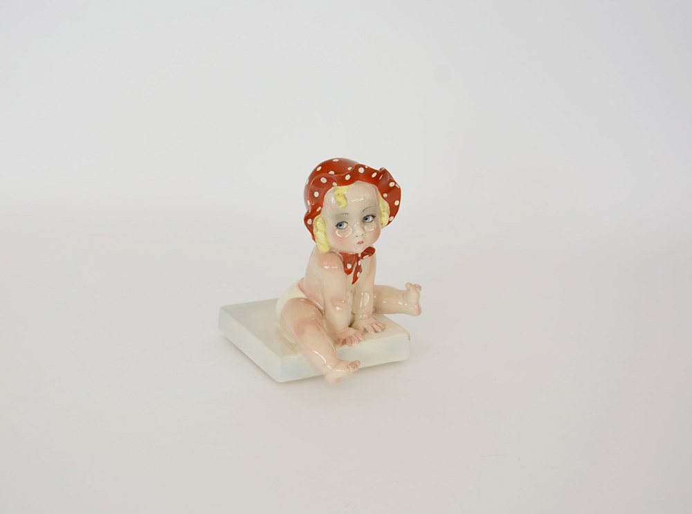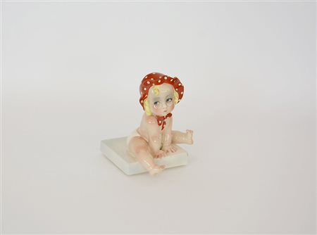 Essevi, Torino. Scultura in ceramica a colaggio smaltata in policromia sotto vetrina raffigurante una bimba. Marcata, locata e datata 1934 sotto la base (h cm 18,5) (lievi difetti)