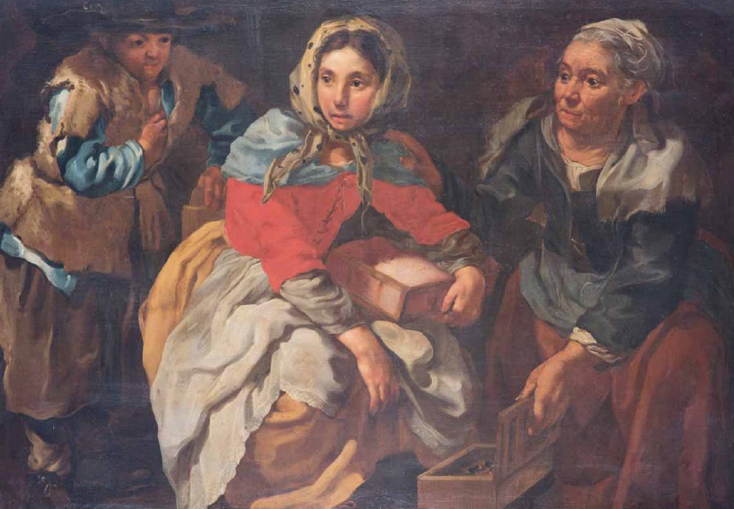 Eberhart Keilhau detto Monsù Bernardo Elsinore 1624 – Roma 1687 INTERNO CON FIGURE DI FANCIULLA CON BIMBO E VECCHIA olio su tela, cm 94 x 132,5. Sono numerose le tele note del pittore danese italianizzato Monsù Bernardo che raffigurano scene di interni o campestri con più fi gure popolari, spesso bambini, intenti a lavori o svaghi domestici. Finora sfuggito alla critica, questo inedito è caratterizzato da un buono stato di conservazione e da una stesura morbida e a tratti vaporosa, secondo i caratteri stilistici facilmente riconoscibili al pittore, al cui catalogo, ricostruito a partire dalla monografia di Minna Heimbürger del 1988, va aggiunta questa nuova tela (cfr. M. Heimbürger, Bernardo Keilhau detto Monsù Bernardo, Roma 1988). L’occhio attento a raccontare con linguaggio pacato la realtà quotidiana, talvolta misera, obbliga a indicare Monsù Bernardo tra i protagonisti della pittura di genere in Italia nel Seicento (cfr. Da Caravaggio a Ceruti. La scena di genere e l’immagine dei pitocchi nella pittura italiana, a cura di F. Porzio, 1998). Nativo di una cittadina danese e poi formatosi ad Amsterdam alla scuola di Rembrandt, Eberhart Keilhau giunge in Italia nel 1651, prima a Venezia, poi a Bergamo e infi ne a Roma. La sua poetica, prossima a quella dei “Bamboccianti” e finalmente messa a fuoco dalla critica che in passato lo confondeva con Antonio Amorosi, si caratterizza per un ruolo importante conferito alle fi gure nell’economia della composizione: non semplici comparse di una scena d’interno o campestre, ma veri e propri protagonisti, colti nella varietà delle loro espressioni e quindi ciascuno caratterizzato da un personale sentimento. Lo si vede anche in questo significativo inedito a tre fi gure: una fanciulla si accinge a svolgere un lavoro di cucito o ricamo; accanto a lei una vecchia che l’assiste e dietro un bimbo, forse un piccolo popolano o mendicante. L’ambiente circostante non è descritto, come è tipico per Monsù Bernardo, e gli sguardi dei personaggi paiono indipendenti l’uno dall’altro, a conferma che non si tratta del racconto di un episodio di vita quotidiana, ma sempre un’allegoria, come proposto dalla Heimbürger. Il significato non è immediato in casi come questi, in cui manca il contesto di origine della tela, nata forse in coppia o in serie con altre. Forse si tratta di un’allegoria del Tatto, signifi cato che la Heimbürger associa alle fi gure di ricamatrici o fi latrici. Non si conoscono, nel ricco catalogo del Keilhau - che peraltro prevede anche repliche autografe -, altre versioni di questo soggetto, simile, ma con molto varianti, rispetto alle varie “Allegoria della vista” o “Scuola di bambini” genericamente più affollate. Anna Orlando