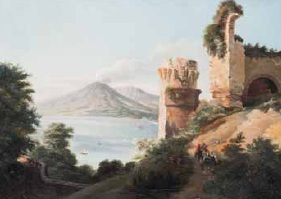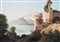 Scuola Francese del XIX secolo PAESAGGIO MARINO CON ROVINE E VULCANO olio su...