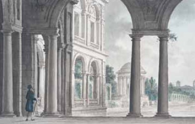 Scuola Francese del XIX secolo SCORCIO ARCHITETTONICO tempera su carta, cm 23,5x36,5.